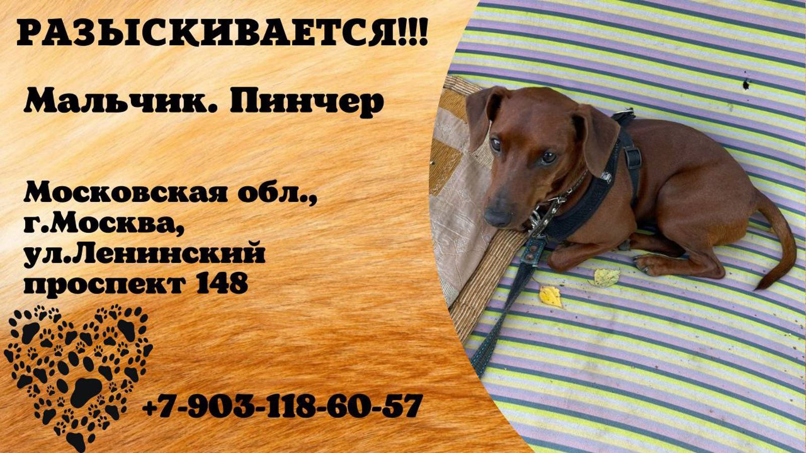 Московская Москва Пропала собака 06.10.2024 в 21.00 Ленинский проспект 148. Кобель рыжий породы цвергпинчер два года. Была одета чёрная шлейка и поводок-рулетка. Побежал в сторону РУДН. 89031186057 Инфо https://vk.com/wall-198815410_155816