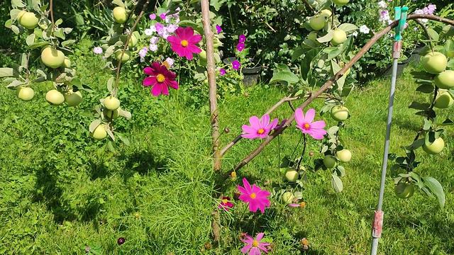 В нашем дворе растения живут своей жизнью, но по принципу: о, свободное место, будем захватывать. В результате мы что-то постоянно обходим боком, ибо снести жаль. А вот яблоня решила вырасти посреди двора, а в середине яблони решила вырасти космея