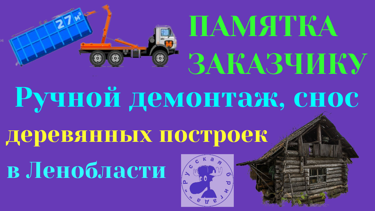 Ручной демонтаж, снос деревянных построек значительно дороже выполнения тех же работ механизированным способом (с применением спецтехники). Но бывают случаи, - и нередко, - когда применение техники на участке или невозможно, или нежелательно. Ручные работы по сносу и демонтажу позволяют нанести минимальный ущерб, как ландшафту участка, так и находящимся на нём другим строениям и элементам коммуникаций. Наша в меру интеллигентная бригада выполняет работы по ручному демонтажу, сносу сараев, бань, дачных и любых деревянных домов, как в черте Санкт-Петербурга, так и по Ленинградской области (до 100 км от КАД или до 100 км от Гатчины). Полный комплекс мероприятий, включая организацию вывоза строительного мусора. Наш сайт: www.сносдомовленинградскаяобласть.рф Наш блог: https://demontazhdomov.blogspot.com/ Мы в Youtube: https://www.youtube.com/channel/UCXjBmKoXBadH7cnuNIeIejQ Или, - если Вы окончательный патриот: мы в Rutube: https://rutube.ru/channel/6433434/ Наша группа Вконтакте: https://vk.com/demontazhdomov Мы даже в Одноклассниках: https://ok.ru/group/58365520838742 Наш телефон: +7 911 998 51 23