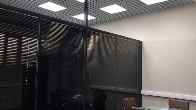 Стеклянные перегородки на черном каркасе со встроенными жалюзи