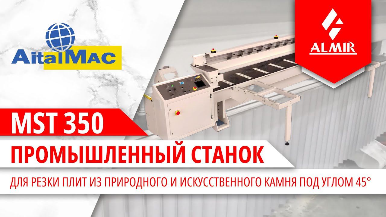 Промышленный станок для точной резки плит из природного и искусственного камня под 45 градусов MST 350 от компании AitalMac. - жесткая конструкция не допускает появления вибраций и помогает создавать четкую и правильную кромку на любых каменных материалах; - специальное приспособление для легкой загрузки и выравнивания плит, пневматические цилиндры для надежной фиксации плиты на столе; - возможность обработки узких полос, точный угол реза с постоянным наклоном.