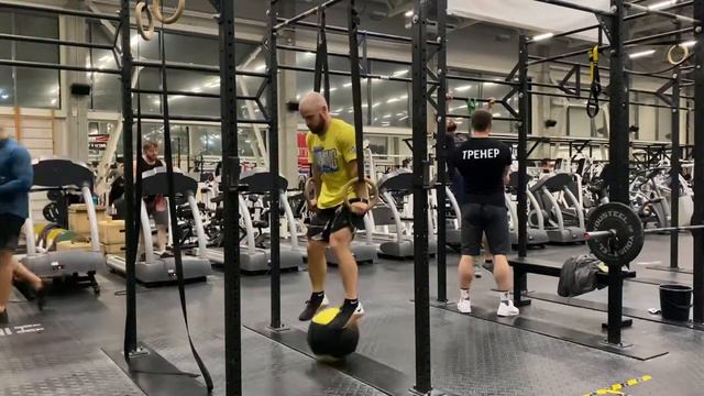 Отжимания на кольцах киппингом с медболом, 3 с вниз, вверх с мячом с коленями у живота с паузой