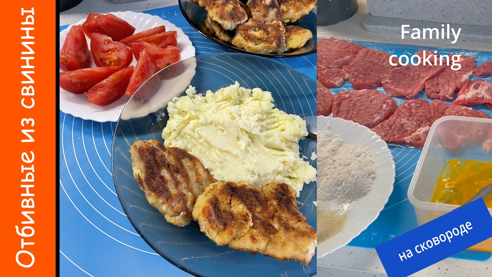 Смотрите все рецепты автора на сайте https://profamilycooking.ru Больше рецептов, удобный поиск и возможность сравнения рецептов на сайте https://piroved.ru Отбивная из свинины в панировке на сковороде - сочное нежное мясо в хрустящей панировке. Вкусное сытное блюдо, особенно с гарниром из картофельного пюре. 00:00 Отбивная из свинины в панировке 00:10 Ингредиенты 00:25 Свинину (я беру вырезку) режем на куски толщиной около 2 см поперек волокон 00:31 Мясо выкладываем на пищевую пленку, накрываем пленкой сверху и отбиваем с двух сторон 00:46 Мясо солим и немного перчим с обеих сторон 00:57 Для панировки подготавливаем муку, панировочные сухари и яйца. Яйца смешиваем в отдельной миске с щепоткой соли 01:09 Мясо обваливаем в муке, затем в яйце и в сухарях с обеих сторон 01:34 На сковороде разогреваем растительное масло, оно должно покрывать дно сковороды. 01:50 Мясо обжариваем по 3-5 мин с каждой стороны. 02:35 После каждой партии масло лучше сливать и наливать свежее. 02:29 Подавать можно с гарниром из картошки и свежими помидорами. Приятного аппетита! Время подготовки ~25 мин Время приготовления ~25 мин Число порций: 6 Калории: ~251.8 ккал. Белки: ~14.8 гр. Жиры: ~19.5 гр. Углеводы: ~4.2 гр. Ингредиенты Вырезка свиная 600 г Мука 100 г Сухари панировочные 100 г Яйца 2 шт Соль Перец #familycooking Песня из видео: MendeX - Fractal Взято с канала: Copyright Free Music Лицензия: не предоставлена Ссылка: youtu.be/hmcct07JlJw Проверено на сайте: https://eproves.com