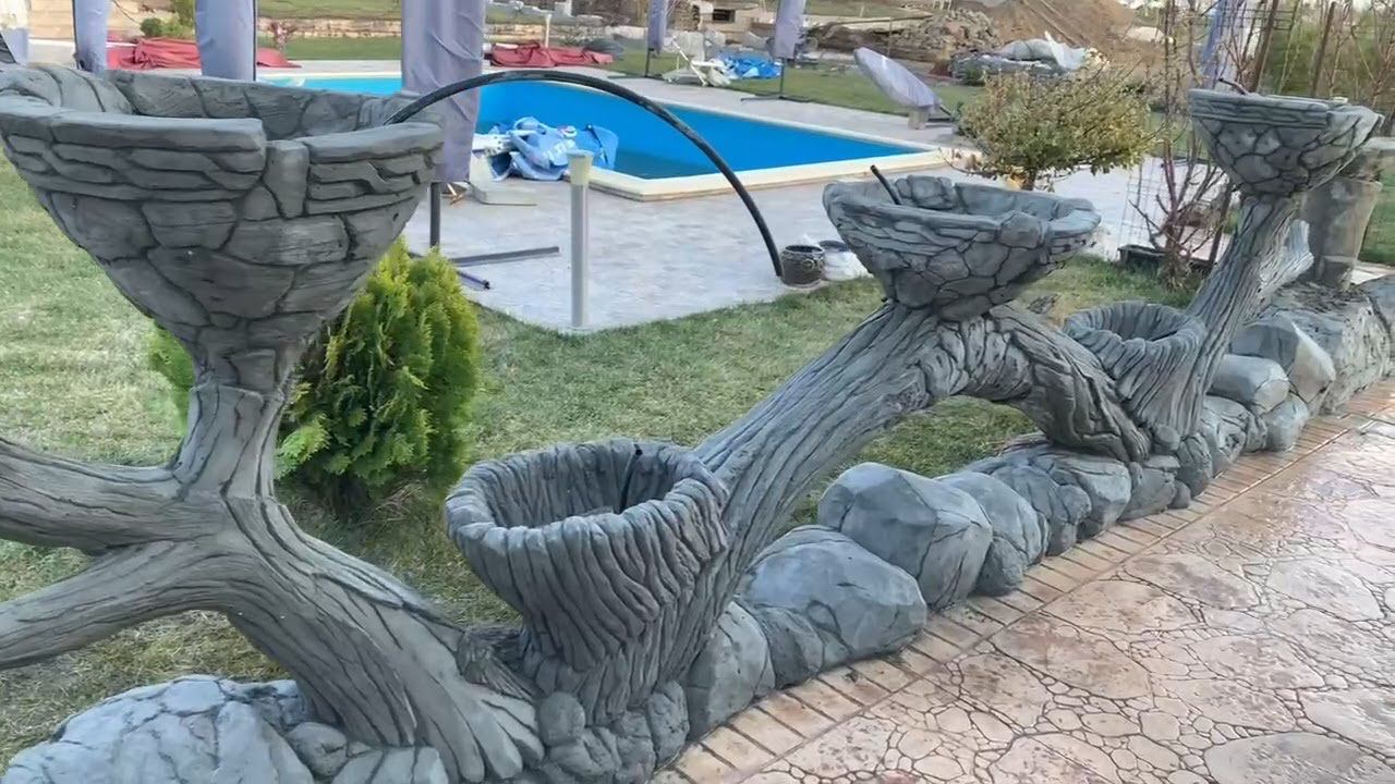 Бревно из бетона. цветочники во дворе из цемента. работа Эльдара Асанова.