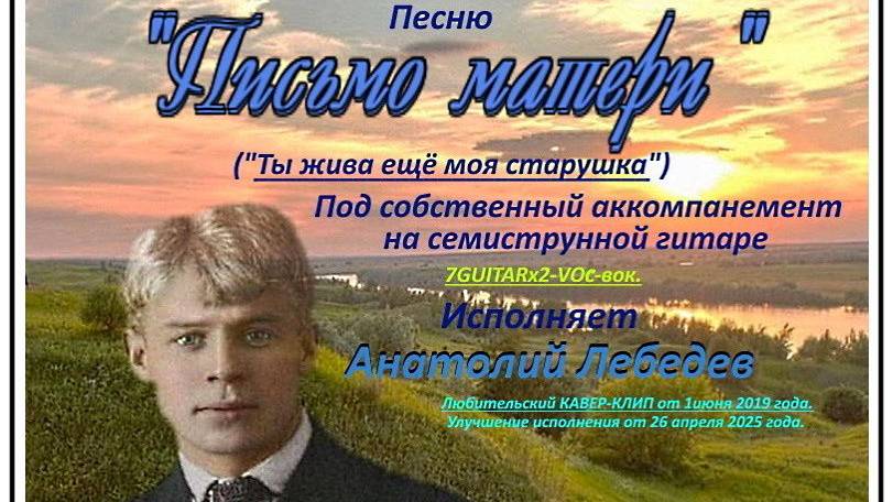 Анатолий Лебедев из Питера. ЛЮБИТЕЛЬСКИЙ КАВЕР-КЛИП Анатолия Лебедева с его исполнением песни "ПИСЬМО МАТЕРИ под собственный аккомпанемент на семиструнной гитаре. Слова (стихотворение С.ЕСЕНИНА 1924 года. Музыка -В. ЛИПАТОВА. (Написана во второй половине 1920-тых годов. Материалы для видеоряда клипа взят из интернета. Фонограмма исполнения песни записана в июне 2019 года. Дополнительный аккомпанемент, работа со звуком и монтаж видеоролика сделаны А. Лебедевым 26 апреля 2025 года.