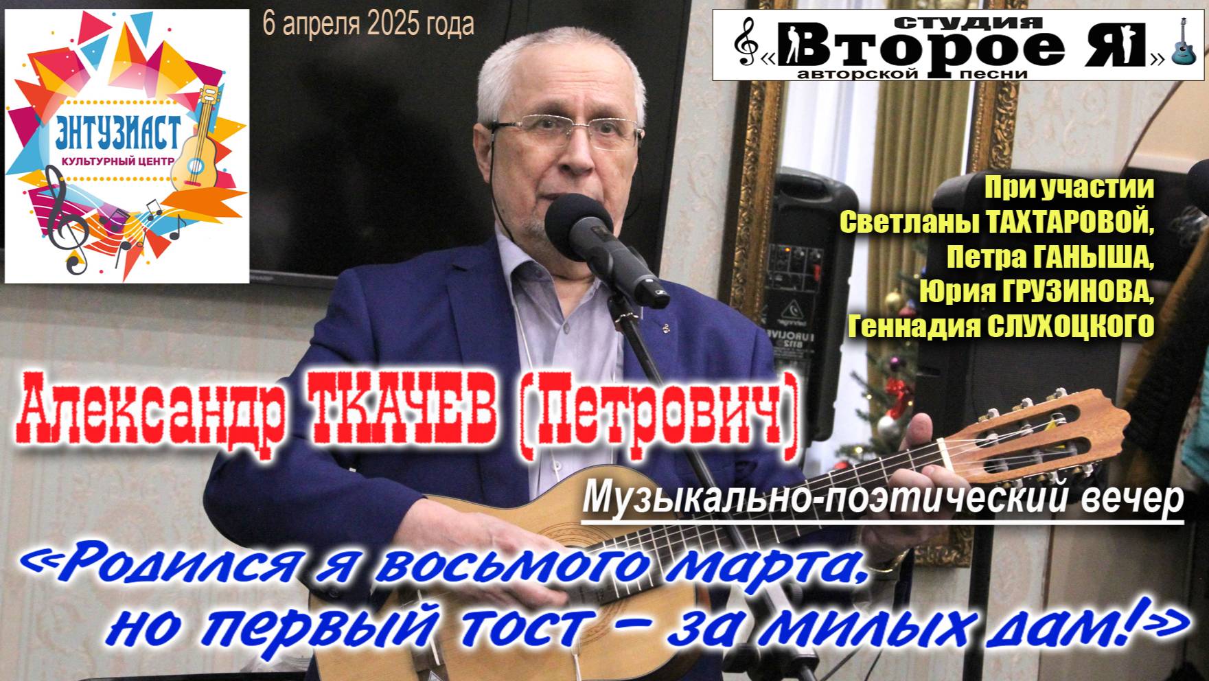 Участники: Александр Ткачев (Петрович), Петр Ганыш, Светлана Тахтарова, Юрий Грузинов и Геннадий Слухоцкий. Продолжительность – 1 час 18 минут. Культурный центр «Энтузиаст»: Москва, Шоссе Энтузиастов, дом 10/2, метро «Площадь Ильича», «Римская», «Авиамоторная». 6 апреля 2025 года.