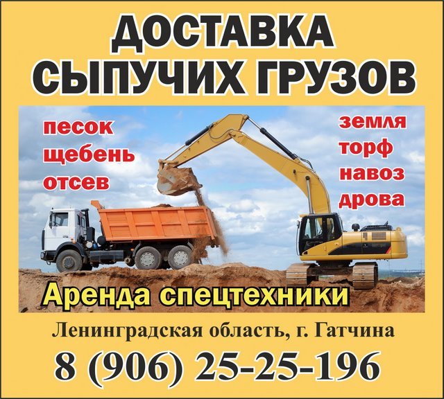 Доставка песка, щебня, земли и других сыпучих грузов в Гатчинском районе. Услуги экскаватора. Аренда спецтехники. Представляем большой ассортимент различных материалов: ПЕСОК - намывной, морской, карьерный ЩЕБЕНЬ - различных фракций ОТСЕВ - красный, желтый, серый ГРУНТ плодородный, земля черная с торфом НАВОЗ- коровий полежавший ДРОВА - колотые, не колотые: береза, ольха, осина и т.д. Также предлагаем: - Вывоз мусора - Услуги экскаватора-погрузчика - Аренда спецтехники Мы работаем как с крупными компаниями, так и с частными лицами. Полностью обеспечиваем строительный объект необходимым материалом. Доставим материалы в необходимый населенный пункт или строительный объект Ленинградской области. Ленинградская область, Гатчинский район, г. Гатчина Тел.: 8 (906) 25-25-196 Тел.: 8 (911) 122-35-98 Сайт: http://песок-щебень-спб.рф/ ВКонтакте: vk.com/public191706510 В Интернете (в поисковиках) нас находят, в частности, по таким словам: доставка песка Гатчина, доставка щебня Гатчина, доставка земли Гатчина, услуги экскаватора Гатчина, аренда спецтехники Гатчина, вывоз мусора Гатчина. #доставкапеска #Гатчина #доставкащебня #Гатчинскийрайон #услугиэкскаватора #Ленинградскаяобласть #арендаспецтехники #вывозмусора