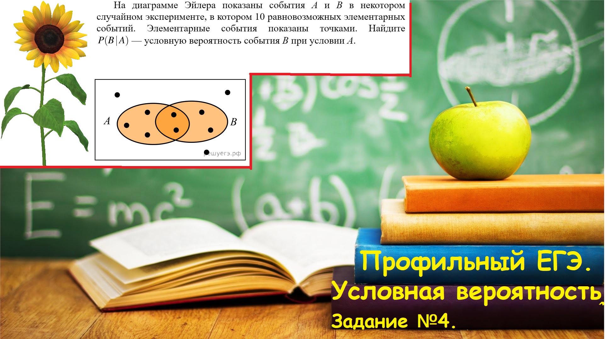 #Профильтеориявероятности #ФормулаУсловнойвероятности #Задание4Условнаявероятность #Условнаявероятность #Новыезадачипотреориивероятности #ДиаграммаЭйлера #МатематикадляЧайников! #ЕГЭ2026 #ПрофильныйЕГЭ2026 #Математика2026 На диаграмме Эйлера показаны события A и B в некотором случайном эксперименте, в котором 10 равновозможных элементарных событий. Элементарные события показаны точками. Найдите P левая круглая скобка B | A правая круглая скобка — условную вероятность события B при условии A. МАТЕРИАЛЫ: ПЛЕЙЛИСТ "РАЗБОР ВАРИАНТОВ ПРОФИЛЬНОГО ЕГЭ":https://rutube.ru/plst/71327/ ПЛЕЙЛИСТ "ЗАДАНИЯ ПРОФИЛЯ.ПЕРВАЯ ЧАСТЬ":https://rutube.ru/plst/71308/ ПЛЕЙЛИСТ "ЗАДАНИЯ ПРОФИЛЯ.ВТОРАЯ ЧАСТЬ. Уравнения":https://rutube.ru/plst/71324/ ПЛЕЙЛИСТ "ЗАДАНИЯ ПРОФИЛЯ.ВТОРАЯ ЧАСТЬ. Неравенства":https://rutube.ru/plst/71326/ ПЛЕЙЛИСТ "ЗАДАНИЯ ПРОФИЛЯ.ВТОРАЯ ЧАСТЬ. Стереометрия":https://rutube.ru/plst/71329/ ПЛЕЙЛИСТ "ЗАДАНИЯ ПРОФИЛЯ.ВТОРАЯ ЧАСТЬ. Планиметрия":https://rutube.ru/plst/98022/ ПЛЕЙЛИСТ "БАЗОВЫЙ ЕГЭ":https://studio.rutube.ru/playlist/71309 #Профиль2025 #ПрофильЯщенко2024 #Условнаявероятность #Профильтеориявероятности ПОДПИШИСЬ: 1. Запасной канал: https://www.youtube.com/channel/UCi7dEdk4b98a86WCUta1MGg 2. Группа: https://vk.com/math_for_dummies
