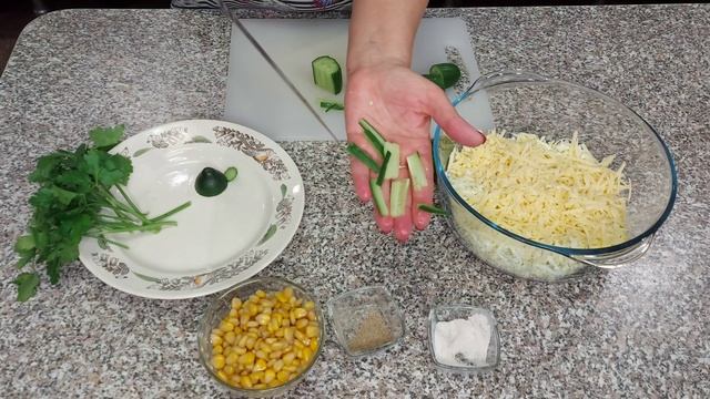 Праздничный салат "Март"/Салат с сыром, консервированной кукурузой и свежим огурцом