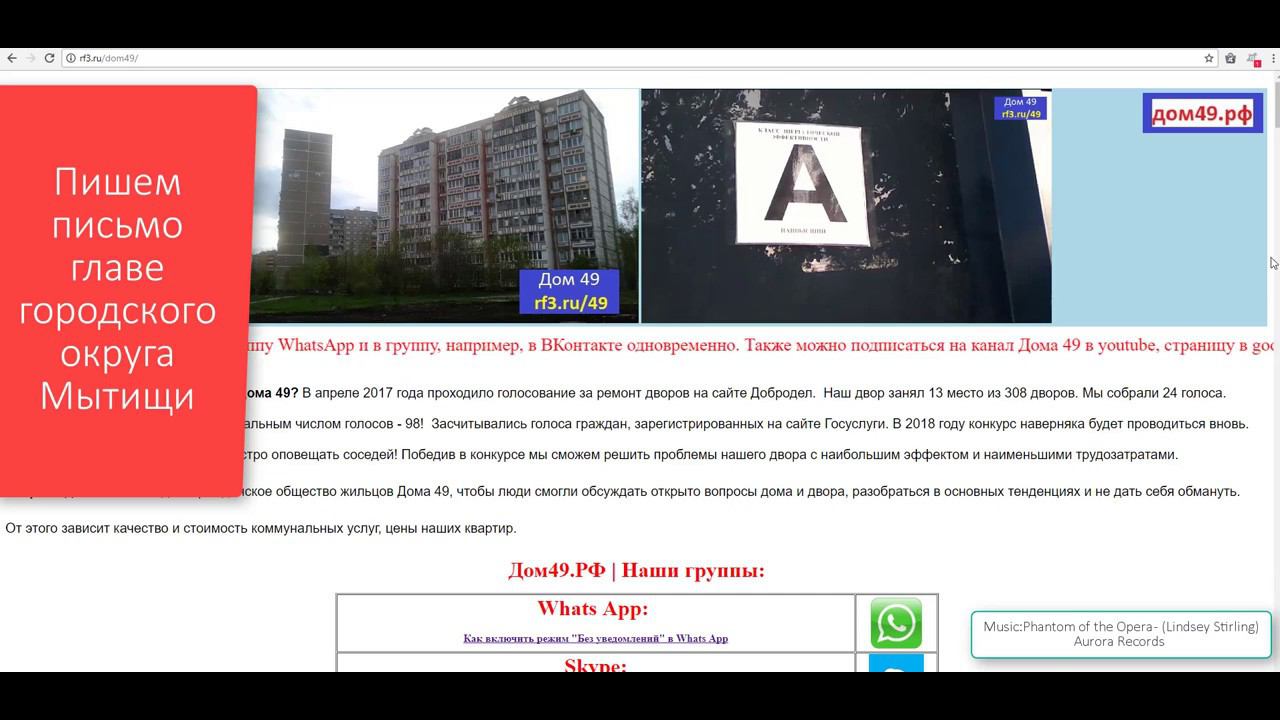 Обращение к главе г.о. Мытищи Как быстро отправить сообщение в любую организацию с сайта Дом49 РФ Сообщение в любую организацию может легко отправить любой житель с главной страницы сайта Дом49.РФ Пишем обращение главе городского округа Мытищи Сайт жильцов Дома 49 http://дом49.рф Сообщество Москва и Подмосковье http://день-москвы.рф Добавляйтесь в Друзья http://dom49.blogspot.ru/2017/07/blog-post_19.html #добродел #жалоба #обращение #Мытищи #Перловка #НИИОХ #благоустройство #жкх #Новомытищинский #дом49 #Подмосковье #Москва #МосковскаяОбласть #СВАО #просьба #коммуналка #Новомытищинскийпроспект #экология #ремонт #ремонтдвора #ремонтдома #госуслуги Music: Phantom of the Opera - (Lindsey Stirling) [10 Hours] Aurora Records https://support.google.com/youtube/answer/2797468