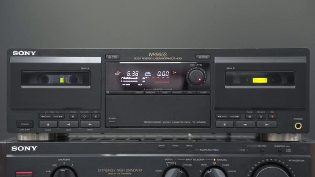 SONY TC-WR965S ¥69,000(1995年発売) A/B両デッキにドルビーS NRを搭載したツイン録再クイックリバースデッキ。 テープ2本への同時録音、Aデッキ両面の録音が終了するとBデッキが受け継ぎ、長時間の録音が可能なリレー録音などが行えます。また、テープ反転時の音切れの少ないクイックリバースメカを搭載しています。 ノイズリダクションシステムとしてドルビーS NRをA/Bデッキに独立搭載しています。 Aデッキにワイドレンジ・ピッチコントロール機能を搭載しており、再生時にテープスピードを±30%の範囲で調整できます。 AデッキからBデッキへ、曲順を入れ替えてのテープ編集が簡単に行える28曲(片面14曲)RMS(ランダム・ミュージック・センサー)機能を搭載しています。再生側のAデッキで曲順をプログラムし、ボタン一つで選曲を開始します。曲が見つかるとBデッキの録音が開始され、次の曲の頭出し中は録音ポーズで待機状態となります。 ハイスピードダビング機能を搭載しており、半分の時間でダビングが可能です。 ファインセラミックコンポジット材をカセットホルダーに使用することで振動を吸収しています。さらに、カセットリッドにアルミ押出し材を使用することで精度向上を図っています。 カセットスタビライザーを搭載しており、テープ装填と同時にカセットドア内部のスタビライザーがハーフを固定し、テープの振動を抑えこみます。 ヘッド巻線に高純度無酸素銅PC-OCCを採用したPC-OCC巻線レーザーアモルファスヘッドを採用しています。 ドルビーHX-PROを両デッキに独立搭載しています。 バイアス電流を信号の周波数やレベルに応じて1千分の1秒単位でコントロールすることで、高域のリニアリティを良好に保っています。 バイアス周波数を160kHzにしたスーパーバイアスを採用することで、バイアス信号の周波数をオーディオ信号帯域から離し、バイアスがオーディオ信号に与える干渉を低減しています。 テープごとに異なる磁性体の特性に合わせ、バイアス量と録音レベルを自動的にチューニングするオートキャリブレーションを両デッキに独立搭載しています。 サウンドオートフォーカスを搭載しており、録音レベルの設定をマイコンで制御しています。 この機能では、テープポジションやドルビーNRの有無を検知するとともに、入力レベルに応じて録音レベルを自動調整することで、レベルオーバーによる失敗を減らしています。 減算機能を搭載したFLリニアカウンターを搭載しています。 フェーダーボタンを装備しており、録音時にボタン一つでフェードイン/フェードアウトが可能です。 また、別売りタイマーを使っての録音にも対応しています。 マルチAMSを搭載しており、再生中の曲を基準として前後30曲までの素早い頭出しが可能です。 ワイヤレスリモコンが付属しています。 型式 カセットデッキ 形式 4トラック2チャンネル ヘッド 消去:2 録再:2 モーター DCサーボモーター:2 DCモーター:4 SN比 57dB(EIAJ、ドルビーNR off、メタルテープ) 78dB(ドルビーNR C、ピークレベル、メタルテープ、聴感補正) 周波数特性 25Hz~19kHz ±3dB(EIAJ、-20dB録音、メタルテープ) 30Hz~15kHz ±3dB(-4dB録音、メタルテープ) ワウ・フラッター (EIAJ) ±0.09%Wpeak 0.05%WRMS 歪率(EIAJ) 1.8%(第3次高調波歪率、基準録音レベル250nWb/m、315Hz正弦波、メタルテープ) 電源電圧 AC100V、50Hz/60Hz 消費電力 27W 外形寸法 幅430x高さ135x奥行350mm 重量 約6.5kg 付属 ワイヤレスリモコン RM-J902