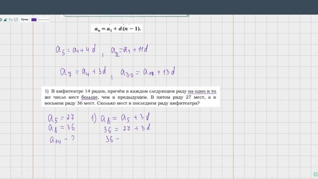 1) В амфитеатре 14 рядов, причём в каждом следующем ряду на одно и то же число мест больше, чем в предыдущем. В пятом ряду 27 мест, а в восьмом ряду 36 мест. Сколько мест в последнем ряду амфитеатра?