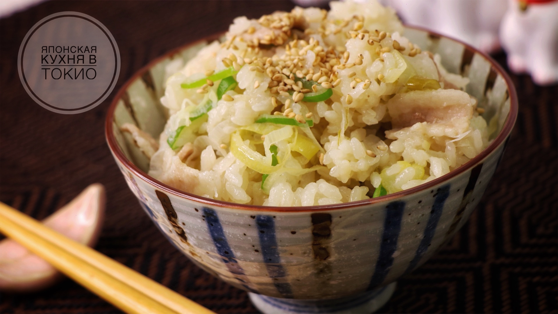 Ингредиенты: 1. Рис - 300 г. 2. Вода - 400 мл. 3. Свинина - 150 г 4. Лук-порей - 100-150г. 5. Соль - 1 ч.л. 6. Соевый соус - 0,5 ст.л. 7. Рыбный бульон Хондаши - 1 ч.л. 8. Кунжутное масло - 1 ст.л. 9. Кунжут - по вкусу.