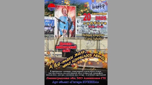 III детско-юношеский слёт «А всё-таки жаль, что кончилось лето». Арт-объект «Гитара Кукина». 20 сентября 2025 г. Ведущая - Елена Гудкова. Видеозапись - Алла Левитан. Запись и обработка звука - Герман Колосов. Ленинградская обл., Ломоносовский р-н, МО Аннинское ГП.