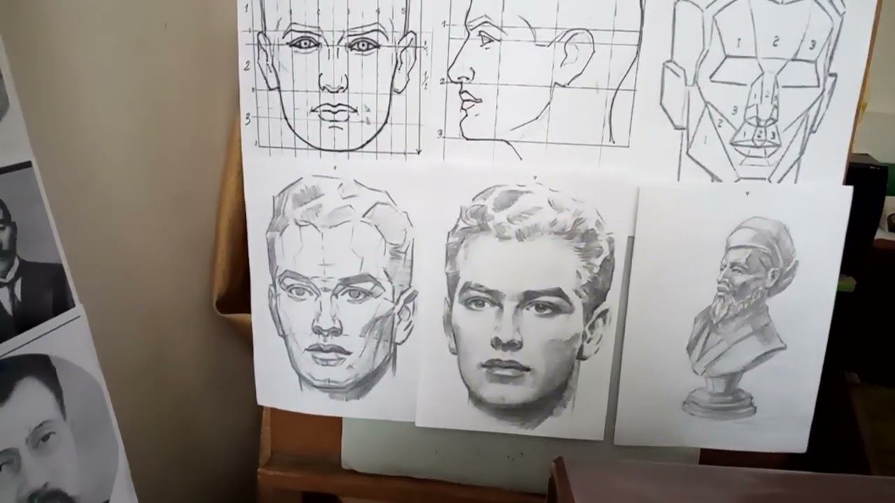 Учитель продолжает урок по лепке круглой скульптуры портрета, проверяя набранную общую массу головы и готовясь к детальной проработке лицевой части по пропорциональной сетке. В качестве образца выбран исторический портрет Аль-Фараби для создания объёмного портрета. Проверка общей массы Масса головы держит пропорции со всех ракурсов: профиль, затылок, ключичный пояс, подставочка — всё устойчиво. Композиция готова к следующему этапу без перекосов. Пропорции лица по сетке Перед детализацией обязательна сверка с пропорциональной сеткой головы: точные замеры глаз, носа, рта, пропорций. Лицевая часть выстраивается строго по схеме для анатомической точности. Образец для лепки Портрет Аль-Фараби служит эталоном — объёмная круглая скульптура требует полного охвата головы (не профиль). На столе пособия, наброски и предыдущие работы для сверки. Урок переходит к практической демонстрации лепки лица по пропорциям. Автор - художник Гончаров Николай Васильевич (1944-2025)