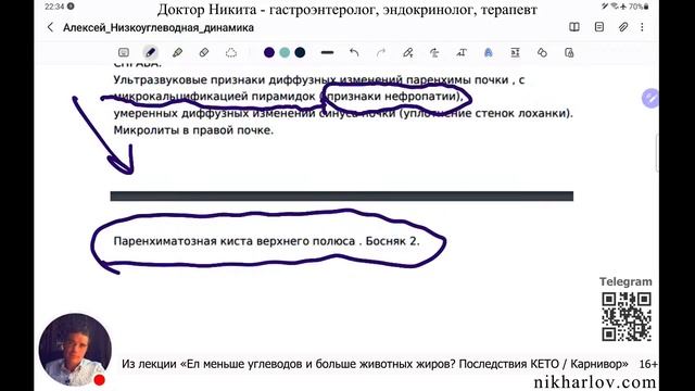 Изменения в УЗИ органов брюшной полости: Смешанное питание ➔ вегетарианство ➔ низкоуглеводная диета Пациент: смешанное питание, вегетарианство, низкоуглеводная диета. Результаты ультразвукового исследования (УЗИ) органов брюшной полости. Смешанное питание и вегетарианство. УЗИ показывает признаки хронического панкреатита и возможного ожирения поджелудочной железы. Взвесь в желчном пузыре как начальные признаки зарождения камней в желчном пузыре. После того что было на вегетарианстве и до начала низкоуглеводного питания (через два года) ситуация ухудшилась. Появились признаки ожирения печени, липоматоз, печень стала жирнее. Обнаружена деформация желчного пузыря и взвесь в желчном пузыре. У поджелудочной железы кроме признаков ожирения и панкреатита появились точечные очаги фиброза. В это же время (за два года) признаки нефропатии почек как результат начала диабета, и микрокальцинация почечных пирамидок. Хотя явного диабета не было, почки имеют повреждения, появилась даже киста в верхней части одной из почек. Низкоуглеводная диета на кето питании дала улучшение. Печень и поджелудочная железа поздоровели и на УЗИ выглядели отлично. Кетоз и добавка жиров сделали только лучше. Но сохранилась деформация (перегиб) желчного пузыря. Возможно это произошло на смешанном питании. Но желчный пузырь стал чистым, нет признаков взвеси. Пациент вернулся на работу ➔ хронический стресс ➔ перешел на смешанное питание. Состояние печени ухудшилось, она стала снова ожиревать. В желчном пузыре снова появилась взвесь. Поджелудочная железа также как печень стала жиреть. Это результат того что уход от кето на смешанное питание ухудшил метаболизм. Если у кетозника хорошо усваиваются и сжигаются жиры, значит они хорошо и запасаются. Но когда кетозник начинает потреблять больше углеводов и не сокращает жиры, он начинает ожиревать быстрее. Это как дверь перехода в метаболизм ожирения. Ультразвуковое исследование брюшной полости, ожирение печени, фиброз поджелудочной, липоматоз печени. #ПолостьБрюшнаяУзи #Углеводы #КетоДиета #ПитаниеНизкоуглеводное #Питание Смешанное #Вегетарианство #ДиетаНизкоуглеводная #ПеченьОжирение #ЖелезаПоджелудочная #ПузырьЖелчный ===== Информация в данном видео предоставлена для ознакомления и расширения кругозора. Не является призывом к действию, НЕ заменяет консультации вашего лечащего врача. По вопросам вашего здоровья и возможных действий проконсультируйтесь с вашим медицинским профессионалом. ===== dr nik, doctor nikita, dr nikita, doctor nik, никита харлов ▶️ Полная лекция: Что если не есть углеводы и есть больше животных жиров? Последствия КЕТО диеты / Карнивор диета. https://www.youtube.com/watch?v=E9jJq4ki6II 📘 Альбом: Вред КЕТО диеты. Как убивает кетогенная диета. Кетоз вред. Снижение углеводов сок