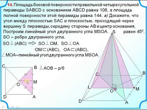Площадь боковой поверхности правильной четырехугольной пирамиды SABCD с основанием ABCD равна 108, а площадь полной поверхности этой пирамиды равна 144. а) Докажите, что угол между плоскостью SAC и плоскостью, проходящей через вершину S пирамиды, середину стороны АВ и центр основания, равен 45⁰. б) Найдите площадь сечения пирамиды плоскостью SAC.