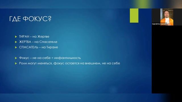 Запись Zoom - встречи :: 27.03.21 - Как часто Вы попадаете в этот злосчастный треугольник ? - Кем Вы чаще всего оказываетесь: Тираном, Жертвой? А может, Спасителем? Зачем вообще нужны эти роли, и в чем их польза? Как выйти красиво из этого треугольника? - - - ✅ Присоединяйтесь! ✅ Приглашайте друзей! Анонсы новых встреч и полезные практики в Телеграмм-чате: ✔️ ТЕЛЕГРАМ: https://t.me/sergey_kosterenko ✔️INSTAGRAM: https://www.instagram.com/kosterenko.sergey #сергейкостеренко #глобальноевзросление #взросление #человечество #человек #зрелость #коуч #коучинг #психолог #психология #общение #отношения #знакомства #zoom #конференция #ответы #счастье #любовьксебе #любовь #самооценка #родители #дети #жертва #страдания #польза #спаситель #тиран #треугольниккарпмана