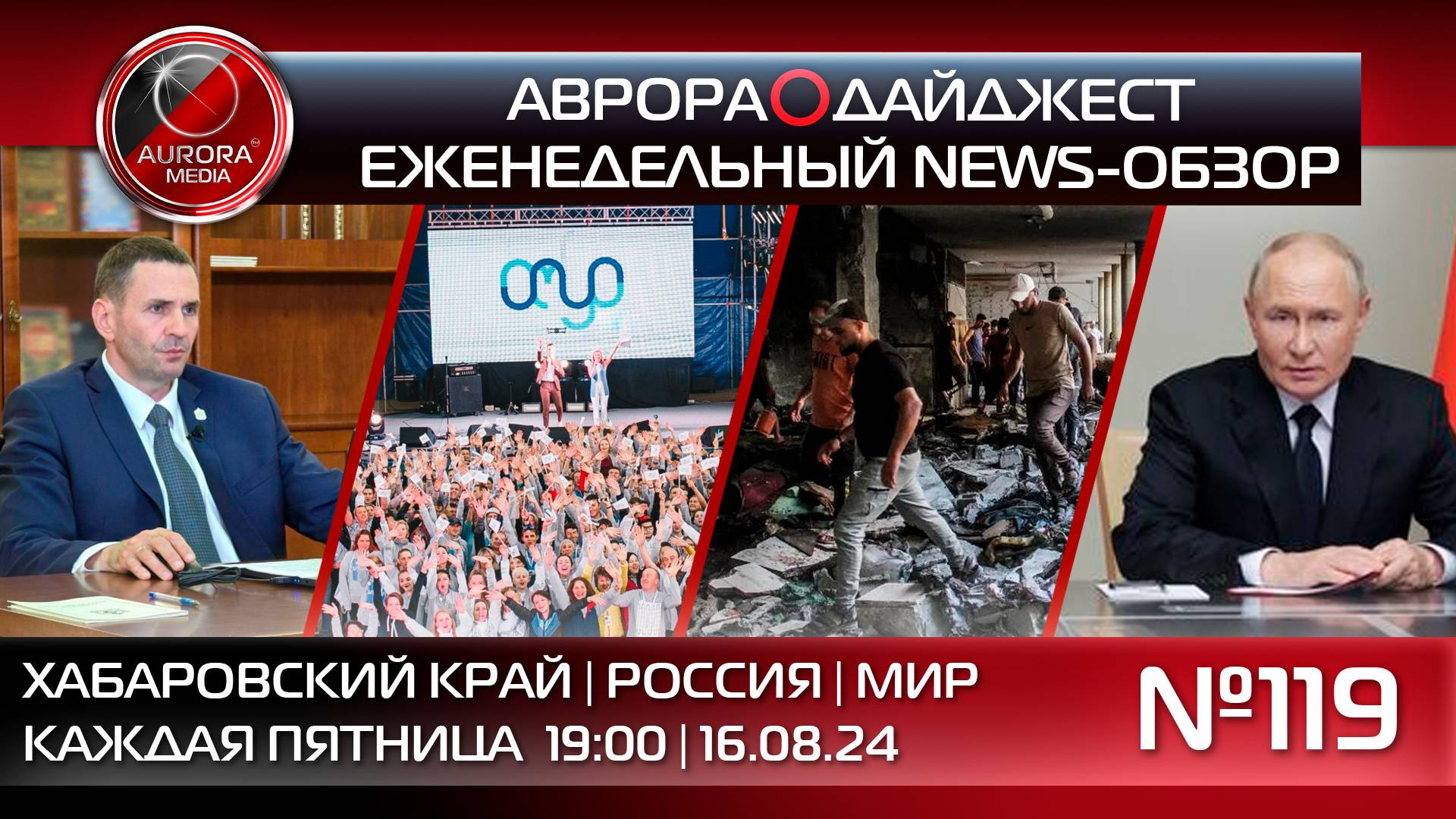 АВРОРА⭕️МЕДИА ЕЖЕНЕДЕЛЬНЫЙ ВИДЕО NEWS-РАЗБОР НЕДЕЛЯ | 09.08.24 - 16.08.24 АВРОРА⭕️ДАЙДЖЕСТ №119 НОВОСТИ ХАБАРОВСКОГО КРАЯ 🚩 ВРИО губернатора провел второй прямой эфир в соцсетях 🚩 Глава региона принял участие в открытии форума «Амур» 🚩 Газопровод до Малмыжского ГОК начали строить в Хабаровском крае 🚩 В регионе установлена новая величина прожиточного минимума на 2025 год 🚩 Сборная Хабаровского края выступит в финале третьего открытого Кубка Дальнего Востока "Игры ГТО" на ВЭФ-2024 НОВОСТИ РОССИИ 🚩 Владимир Путин провел совещание по ситуации в Курской области 🚩 Завершились переговоры президента Владимира Путина и лидера Палестины Махмуда Аббаса НОВОСТИ МИРА 🚩 Израиль ударил по школе в секторе Газа 🚩 ФРГ выдала ордер на арест украинца по делу о подрывах «Северных потоков» | Актуальную информацию читайте: Сайт РИА АВРОРА⭕МЕДИА https://aurora.red/ || Телеграмм-экосистема А⭕М: | АВРОРА МЕДИА @aurora_media https://t.me/aurora_media | АВРОРА НОВОСТИ @news_aurora https://t.me/news_aurora | АВРОРА ХАБАРОВСК @khv_aurora https://t.me/khv_aurora | АВРОРА ЛАЙФ @life_aurora https://t.me/life_aurora | АВРОРА СПОРТ @sport_aurora https://t.me/sport_aurora | АВРОРА ГЕРЛС @girl_aurora https://t.me/girl_aurora | АВРОРА ХАЙТЕК @ht_aurora https://t.me/ht_aurora | АВРОРА ПЕРСОНЫ @people_aurora https://t.me/people_aurora | АВРОРА БЛОГ @media_aurora https://t.me/media_aurora || Aurora_Media: | Российское Информационное Агентство | +7(4212)900-900 media@auroragroup.info | +7(909)800-71-11 messenger #аврорамедиа #дайджест #новости #новостироссии #новостимира #новостихабаровска #новостидв