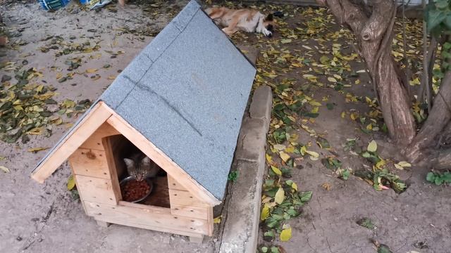 Кошка ест собачью еду прямо в будке пока пёс не видит 2