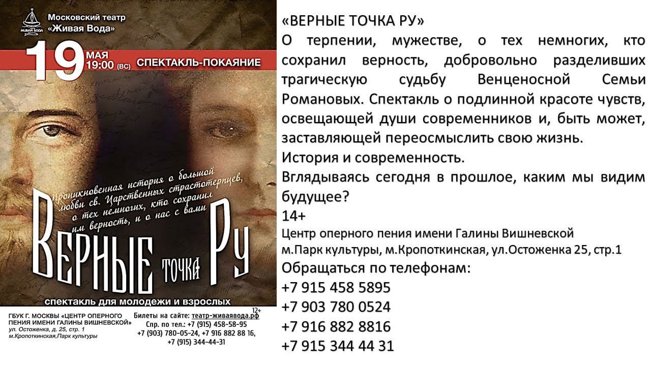 Театр "Живая вода" приглашает принять участие в программе "ПОСВЯЩЕНИЕ НОВОМУЧЕНИКАМ" "Народ, не знающий своего прошлого, не имеет будущего" Михаил Ломоносов Подвиг новомучеников, испивших сугубую чашу скорби, ныне прославленных Церковью в сонме Новомучеников и исповедников Российских - это великая сила, которая способна оживотворять и укреплять жизнь не только Православной Церкви XXI века, но и жизнь всего нашего общества, поскольку своим христианским мужеством они преподают нам великий урок подлинной веры, задают планку нравственной высоты, которая достижима и в наше время. Для того чтобы не повторились горькие ошибки, цена которым – человеческая жизнь, наша память должна хранить не только радостные моменты жизни, но и печальные страницы прошлых лет. Программа, посвящённая новомученикам, поможет расширить представление о том времени лихолетья, глубже осмыслить происходившие события прошедшего столетия. Для приближения этой темы к сердцам молодёжи и наших соотечественников, театр «Живая вода» предлагает предварительно перед посещением спектаклей, группам учащихся, родителям и педагогам посетить БУТОВСКИЙ ПОЛИГОН – памятник истории русской Голгофы. о.Кирилл (Каледа) настоятель храма новомучеников и исповедников российских на Бутовском полигоне благословляет это начинание; будут организованы экскурсии для групп, пожелавших прикоснуться к святыням Бутовского полигона – РУССКОЙ ГОЛГОФЕ. В Программе: Групповые посещения Бутовского полигона: с 12 апреля (пт) по 20 апреля (сб) с 6 мая (пн) по 18 мая (сб)