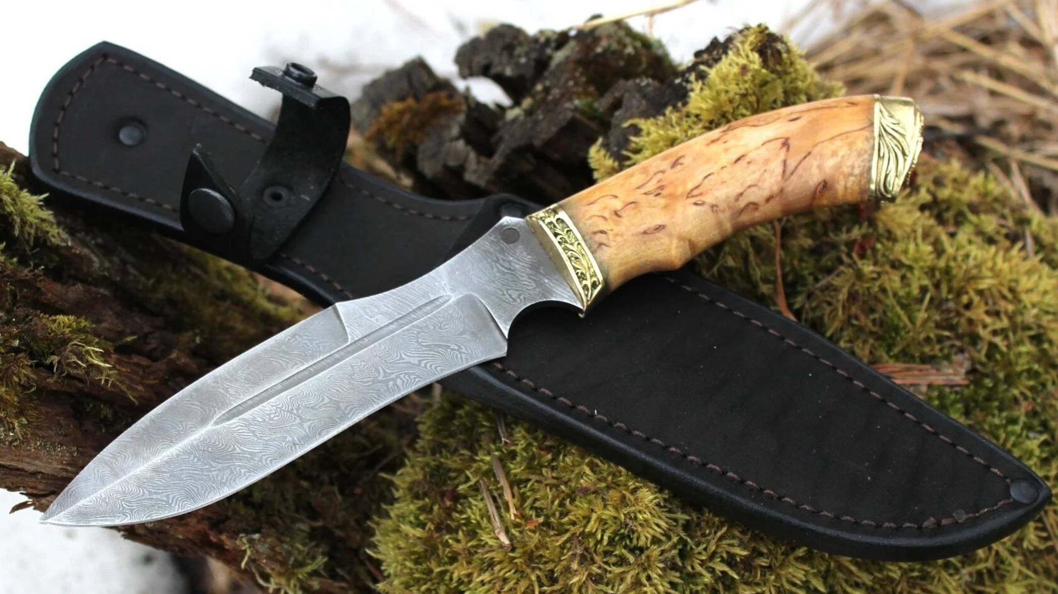 Прототип ножа спецназа с рукоятью из карельской березы и художественным литьем (герб России)