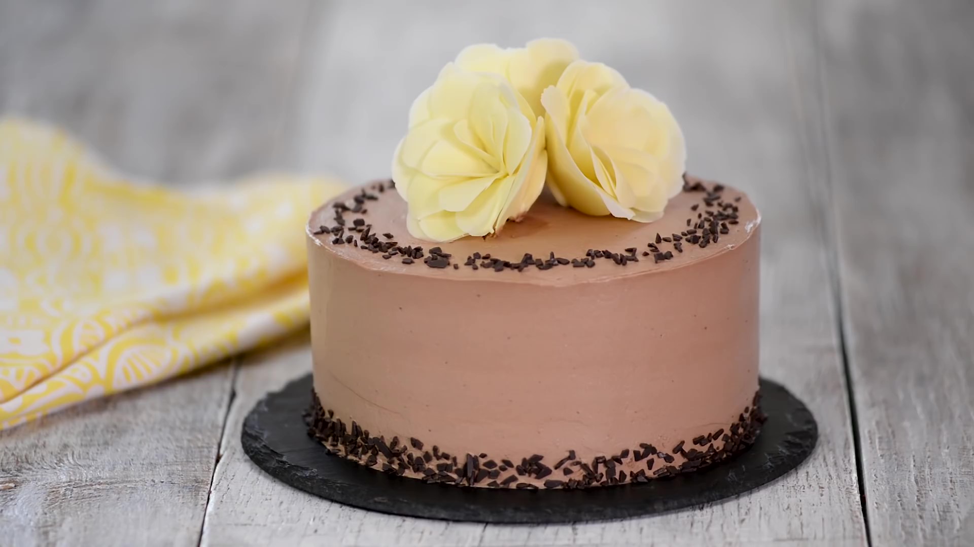 Ингредиенты: «Вес торта 2000 гр.» Для бисквита: 200 г. — сливочного масла 190 г. — сахара 2 — яйца «С0» 200 г. — муки 40 г. — какао-порошка 4 г. — разрыхлителя 2 г. — пищевой соды 1/2 ч.л. соли 1 ч.л. — ванильного экстракта 150 г. — сметаны 20% Для крема: 400 мл. — сливок 33-35% 100 г. — сахара 120 г. — тёмного шоколада 250 г. — маскарпоне Для карамельно-банановой начинки: 2-3 — банана 100 г. — сахара 50 мл. — воды 1/2 ч.л. — соли 100 мл — тёплых сливок 33-35% Как сделать цветы из шоколада • Цветы из шоколада — «Видео как делать цветы, есть на канале» Все ингредиенты для бисквита должны быть комнатной температуры. 1. Приготовить шоколадный крем. В сотейник налить 150 мл. сливок и добавить сахар. Поставить на средний огонь и довести до кипения. Снять с огня, полученной жидкостью залить шоколад. Хорошо перемешать до однородной массы, затем влить оставшиеся охлаждённые сливки и добавить маскарпоне, взбить венчиком до однородной массы. Накрыть полиэтиленовой плёнкой в контакт и убрать крем в холодильник на 4-6 часов. Крем должен хорошо охладиться. 2. Разогреть духовку до 180 °С. 3. Приготовить шоколадный бисквит. В миске смешать муку, какао-порошок, разрыхлитель, пищевую соду и соль. Отложить в сторону. 4. Размягчённое сливочное масло соединить с сахарным песком. Взбить миксером в течение 2 минут. Затем по одному ввести яйца, взбить до однородной массы. Продолжая взбивание добавить ванильный экстракт и сметану. Постепенно ввести сухие ингредиенты и взбить до однородной массы. 5. Готовое тесто разделить на две равные части, вылить в две формы диаметром 20 см, застеленные пергаментной бумагой. Выпекать в разогретой духовке 30-35 минут. Готовность бисквита проверить деревянной шпажкой, если при прокалывании она выходит чистой из бисквита — значит он готов. 6. Готовые бисквиты вынуть из духовки и дать остыть в течение 10 минут. Затем вынуть из формы и дать полностью остыть на решетке. 7. Приготовить карамельно-банановую начинку. Бананы очистить от кожуры и нарезать кружочками средней толщины. 8. В сотейнике соединить сахар с водой. Поставить сотейник на средней огонь и варить «не помешивая, чтобы сахар не кристаллизовался» до получения янтарного цвета, не передержите иначе появится горький привкус. Как только цвет появится добавить тёплые сливки и хорошо перемешать до однородной массы. Уменьшить огонь, добавить соль и бананы, хорошо перемешать. Варить на медленном огне в течение 2 минут, бананы должны стать мягкими, но не разварится. Снять сотейник с огня, перелить начинку в чистую миску и остудить до комнатной температуры. 9. Шоколадный крем достать из холодильника и взбить миксером до крепких пиков. 10. Собрать торт. Каждый бисквит разрезать на две равные части. Первый корж положить на подставку для торта и промазать кремом. С помощью кондитерского мешка нанести небольшое количество крема по диаметру коржа, затем середину заполнить карамельно-банановой начинкой. Поверх начинки выдавить, ещё немного крема. Сверху положить второй корж, повторить всё тоже с оставшимися коржами. Верх и бока торта покрыть кремом. Убрать торт в холодильник на 4-6 часов. 11. Достать торт из холодильника и украсить шоколадными цветами. Края торта посыпать шоколадной крошкой.