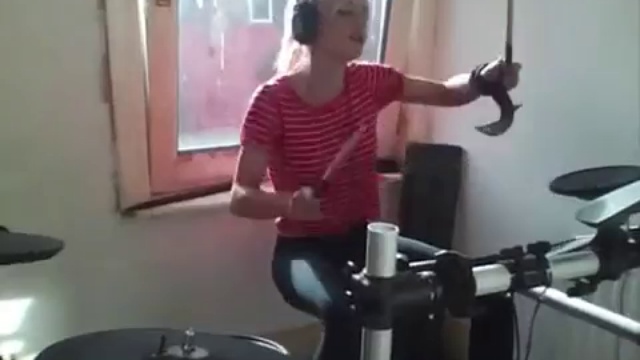 Девушка прикольно играет на барабанах