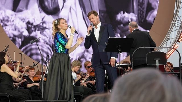 Елена Терентьева и Иван Викулов исполняют "Под Луной золотой" Дунаевского. Дирижёр — Сергей Скрипка