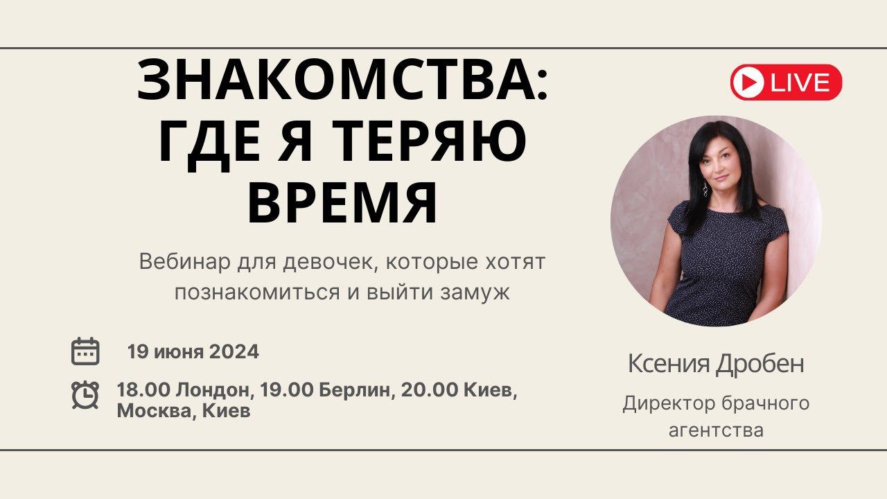 Девочкин вебинар состоится сегодня, в среду 19 июня. Тема «Знакомства: где я теряю время зря» Время: 18.00 по Лондону, 19.00 по Берлину, 20.00 по Москве, Киеву и Минску Вебинар пройдет на платформах: на канале YouTube Ksenia Droben https://www.youtube.com/@KseniaDrobenPartnervermittlung На странице Facebook https://www.facebook.com/ksenia.droben В группе Facebook https://www.facebook.com/groups/datingmarriageagency VK https://vk.com/kseniadroben Instagram @kseniadroben Tiktok: @kseniadrobendating