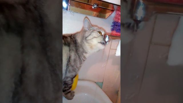 Кошка пьет воду из под крана