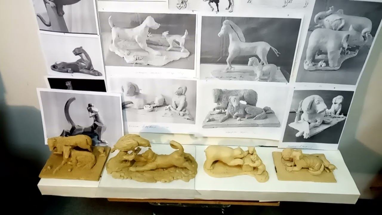 Учитель продолжает урок, используя стенд с ученическими фигурками как основу для демонстрации создания проволочного каркаса. Выбирает динамичную двухфигурную композицию — собачка в растерянности и кот с согнутой спинкой, смотрящий прямо на неё, создавая напряжение и экспрессию. Выбор композиции Фигурки учеников служат вместо эскиза: собака остановилась, кот напрягся, готовый к действию — классика динамики «что произойдёт дальше?». Композиция идеальна для каркаса из-за движения и тонких частей тела. Начало с собачки Крупная собачка идёт первой: по её фигурке с стенда будут делать эскиз и каркас. Процесс начинается с анализа позы и пропорций для точного переноса в проволоку. Демонстрация каркаса продолжается пошагово от собаки к коту. Автор - художник Гончаров Николай Васильевич (1944-2025)