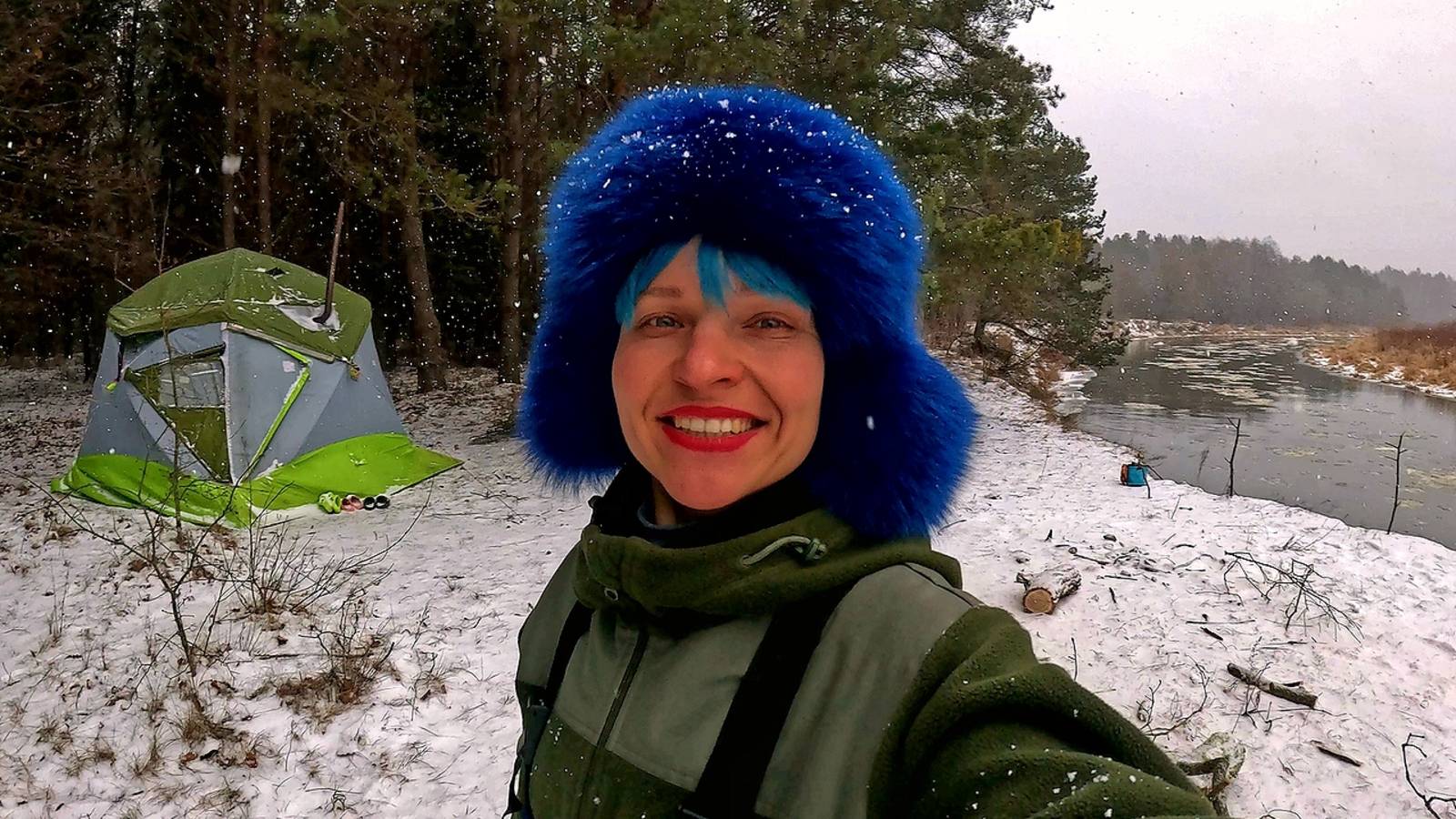 Проснулись утром - мороз. Все закидушки вмерзли в закраины, поэтому собрать их было непросто, несколько оборвала. Решили вместе ехать проверять лесное озеро, которое нашли в лесу. Собрали все зимние снасти и быстро оказались на нужном месте. Толщина льда за сутки увеличилась, но не на столько, чтобы по нему бегать. Я вешу чуть менее 60 кг - лед периодически трещал, но возле берега было комфортно ходить. Миша не стал рисковать. Единственным человеком, который установил жерлицы на озере, была я. Далеко от травы не отходила. Глубины по колено достаточно для того, чтобы поймать щуку. Ее просто нужно найти. Погода менялась, стало резко теплеть, пошел мокрый снег с дождем и в целях безопасности после обеда с водоема решили сворачиваться и возвращаться в лагерь. Теплая палатка ждала нас на берегу, а шуги по реке начинало плыть все меньше и меньше. В планах - банька, ужин и крепкий сон. Утром решили побродить с Ирой и поискать хищника на спиннинг. Благо погода ловле сопутствовала. Ветра не было и мороза тоже.