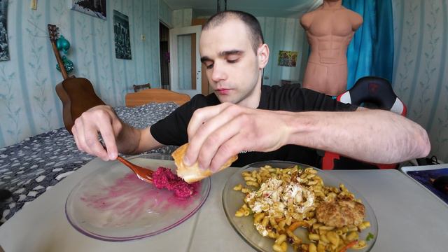 МУКБАНГ МАКАРОНЫ РОЖКИ / КОТЛЕТЫ ДОМАШНИЕ / САЛАТ ИЗ СВЕКЛЫ / ОБЖОР / EATING Mukbang / ASMR АСМР