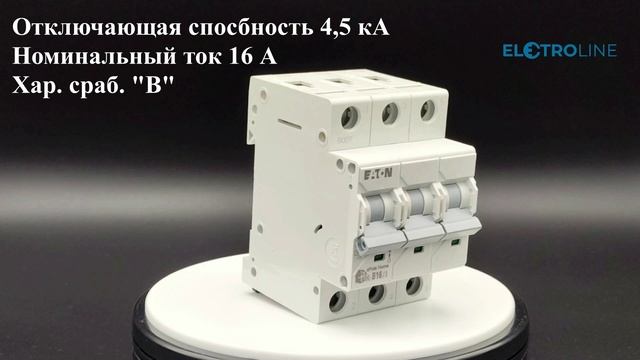 Модульный автоматический выключатель производства Eaton. Трехполюсный, с кривой отключения "B". Номинальный ток 16А. Применяется в жилых помещениях, частных домах и там, где достаточно отключающей способности 4,5 кА. Монтаж на Din-рейку. Подробнее, смотрите на страничке нашего интернет-магазина, по ссылке: https://electroline.ru/product/hl-b163-modulnyy-avtomaticheskiy-vyklyuchatel-3-polyus-krivaya-otklyucheniya-b-nominalnyy-tok-16a.html