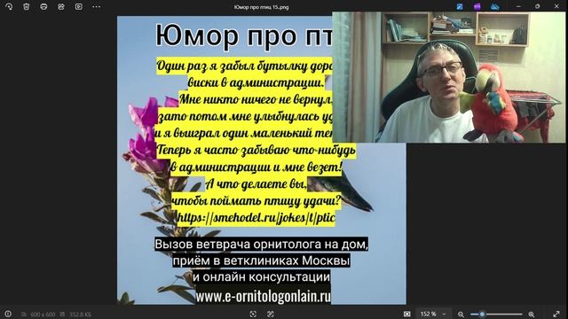 Новый цикл очень коротких видео под названием "Юмор про птиц". Перед вами четвертый пробный вариант, продолжение следует. Ставим пальчики, подписываемся на канал и делимся видео. А если у вас вдруг заболела птица то милости ко мне на мой сайт, там каждый найдет, то что ему нужно. www.e-ornitologonlain.ru Полезные видео смотрим ссылки ниже https://dzen.ru/video/watch/661eaf6e644cdb36af8c0abf Правильное кормление мелких попугаев. https://dzen.ru/video/watch/660c6122a4f78730c576e692 Простой способ взвесить птицу. https://dzen.ru/video/watch/660574051100b61f1f419144 Как правильно фиксировать мелкого и среднего попугая. https://dzen.ru/video/watch/6604561a95d4e1136b712756 Как правильно давать лекарство в клюв попугаю. https://dzen.ru/video/watch/668ae6ed8b2d8178676fa332 Как определить травму лапки у птицы. https://dzen.ru/video/watch/668ae5a1ac340e4b0d511b7f Как определить травму крыла у птицы. #юморптицы #анекдотыпроптиц #орнитологчитаетАнекдоты #лечениептиц #лечениепопугаев #ветврачорнитолог #птицы #вевтрачорнитологЧугуевский Берегите и любите своих пернатых питомцев и они ответят вам взаимностью. Ветврач орнитолог Чугуевский Владимир.