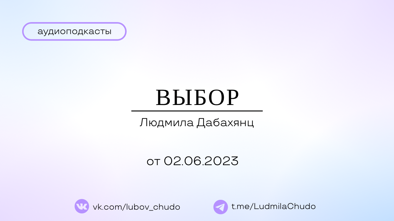 Аудиоподкаст от 02.06.2023 На тему «Выбор» ТЫ МОЖЕШЬ ПРИЙТИ СО СВОИМ ЗАПРОСОМ! Пишите в личку в telegram: https://t.me/ludmiladbc ✓ Обязательно поставь 💗 ✓ Подпишись на канал ✓ И поделись с близкими Это будет вашим балансом за движение и получение энергии. Если есть желание создать баланс брать-давать... приму от всего сердца с благословением (донейшн) С Огромной Любовью, Дабахянц Людмила 💓 ✨ Telegram: https://t.me/ludmiladbc ✨ Канал в telegram “Я ЕСТЬ ТО, ЧТО Я ЕСТЬ”: https://t.me/LudmilaChudo ✨Онлайн-школа: https://ludmilachudo.skillspace.ru/school