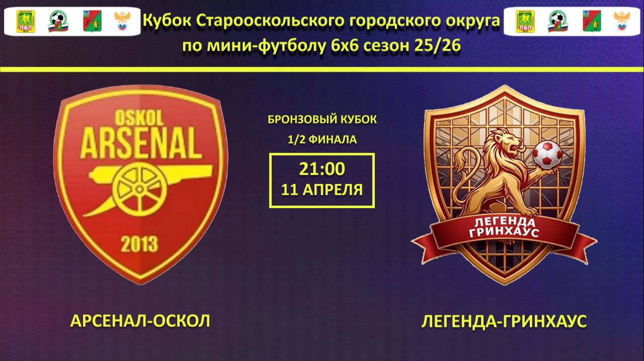 АРСЕНАЛ-ОСКОЛ -- ЛЕГЕНДА-ГРИНХАУС | 1/2 финала Бронзового Кубка Города по мини-футолу 6х6 сезон 25/26 | Кубок Города Старый Оскол сезон 2026 в формате 6*6 г. Старый Оскол мкр-н Надежды 14 Арена N1 Поле 1