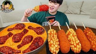 АСМР МУКБАНГ Хрустящая жареная курица, острая лапша, Хрустящий хот-дог рецепт !