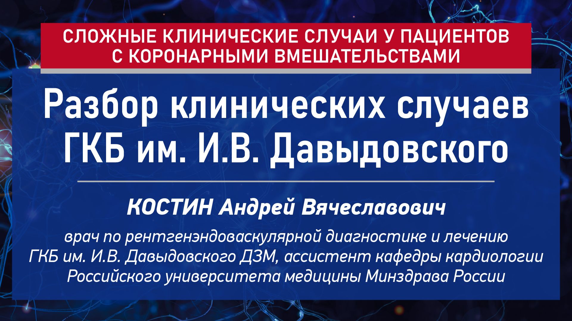 Сложные клинические случаи у пациентов с коронарными вмешательствами Разбор клинических случаев ГКБ им. И.В. Давыдовского Костин Андрей Вячеславович врач по рентгенэндоваскулярной диагностике и лечению ГКБ им. И.В. Давыдовского ДЗМ, ассистент кафедры кардиологии Российского университета медицины Минздрава России