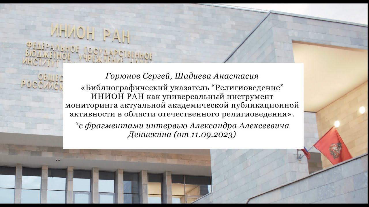 Горюнов Сергей, Шадиева Анастасия. «Библиографический указатель “Религиоведение” ИНИОН РАН как универсальный инструмент мониторинга актуальной академической публикационной активности в области отечественного религиоведения» (с фрагментами интервью Александра Алексеевича Денискина от 11.09.2023). Доклад на VI Конгрессе Русского религиоведческого общества.