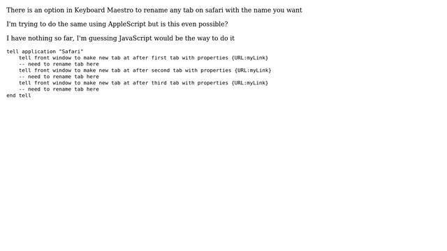 Apple: AppleScript to rename Safari Tab Helpful? Please support me on Patreon: https://www.patreon.com/roelvandepaar With thanks & praise to God, and with thanks to the many people who have made this project possible! | Content (except music & images) licensed under CC BY-SA https://meta.stackexchange.com/help/licensing | Music: https://www.bensound.com/licensing | Images: https://stocksnap.io/license & others | With thanks to user user3439894 (apple.stackexchange.com/users/115523), user Kevin (apple.stackexchange.com/users/124098), and the Stack Exchange Network (apple.stackexchange.com/questions/345128). Trademarks are property of their respective owners. Disclaimer: All information is provided "AS IS" without warranty of any kind. You are responsible for your own actions. Please contact me if anything is amiss at Roel D.OT VandePaar A.T gmail.com