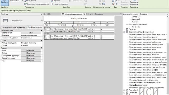 Создание спецификации и ведомости окон.
