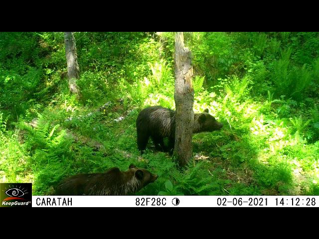 Фоторегистратор запечатлел двух взрослых бурых медведей в одном кадре. Крупный, темный — самец, помельче, бурая — самка. Такое поведение характерно для периода гона, который начинается обычно в конце мая, заканчивается в начале июля. Установка фоторегистратора - государственный инспектор С. Кульбацкая.