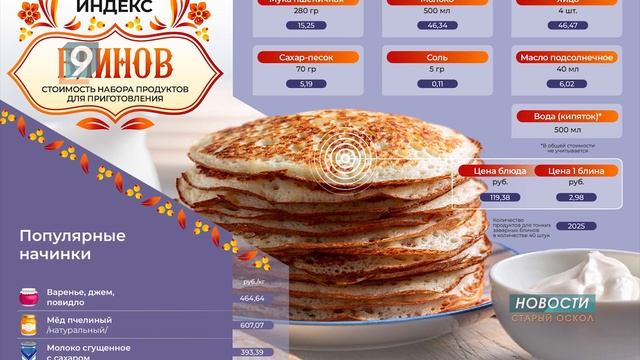 280 граммов пшеничной муки, по пол-литра молока и кипятка, 4 яйца, сахара - 70 граммов, соли - 5 гр., 40 мл растительного масла - один из простейших рецептов главного лакомства этой недели. Смеси должно хватить примерно на 40 блинов - как раз для трапезы среднестатистической семьи из 4 человек. Стоимость продуктов для этого блюда составляет почти 120 рублей - это на 4,4% выше, чем на прошлую Масленицу. Индекс блинов подсчитали в Центре стратегических разработок. Дешевле всего приготовление блинов обойдется в Республике Мордовия - 97,5 руб., а самый дорогой набор – на Чукотке: 237 руб. 29 коп. Среди ЦФО лидер по наименьшей стоимости - Рязанская область - 105 руб. Белгородчина на втором месте - 111 руб. за набор продуктов. Еще одна интересная цифра - на среднюю по России зарплату можно напечь почти 41 тыс. блинов. Также, в пересчете на российский рубль самые дешевые блины – в Беларуси и Казахстане: порция там обойдется в 97 и 108 руб. соответственно. Тарелка из 40 блинов в Японии стоит в два раза дороже, чем в России - 227 руб., в США - 257. Еще дороже в Канаде – 274 руб.