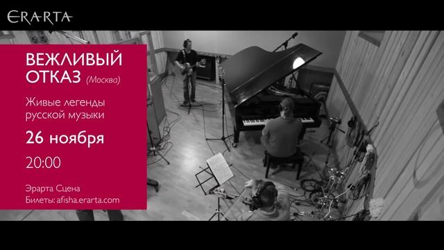 26 ноября 2015 г. в Санкт-Петербурге в зале Эрарта Сцена состоится концерт московской группы «Вежливый отказ». Подробности и билеты онлайн http://www.erarta.com/ru/calendar/events/detail/7ccb234e-556a-11e5-8dc3-8920284aa333/