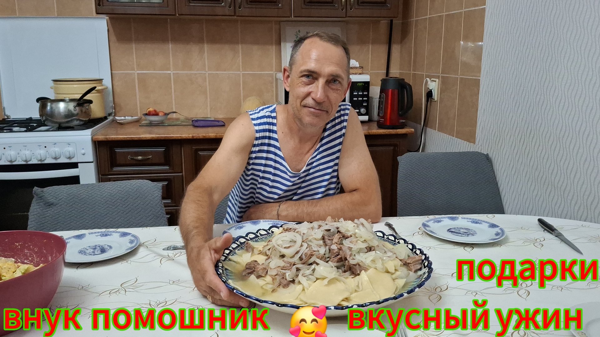 Гости ,угощаем вкусным ужином,подарочки,помошники.
