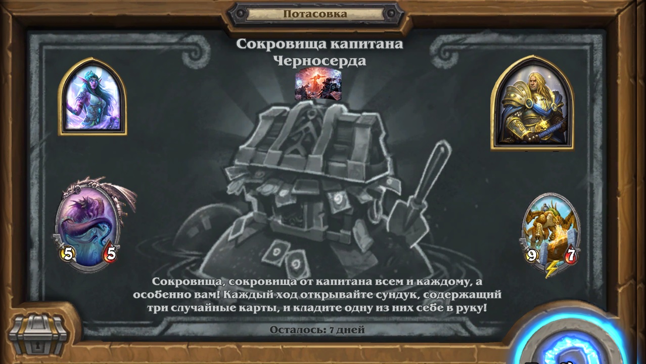 Потасовка в Hearthstone, в период с 20.04.2022 - 27.04.2022 Потасовка: Сокровища капитана Черносерда Сокровища, сокровища капитана всем и каждому, а особенно вам! Каждый ход открывайте сундук, содержащий три случайные карты, и кладите одну из них севе в руку!