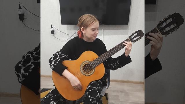 Алена Чурбакова пробует играть боем.( " четверкой"), быстро переставлять аккорды и одновременно правильно петь песню Алены Швец " Первое свидание".