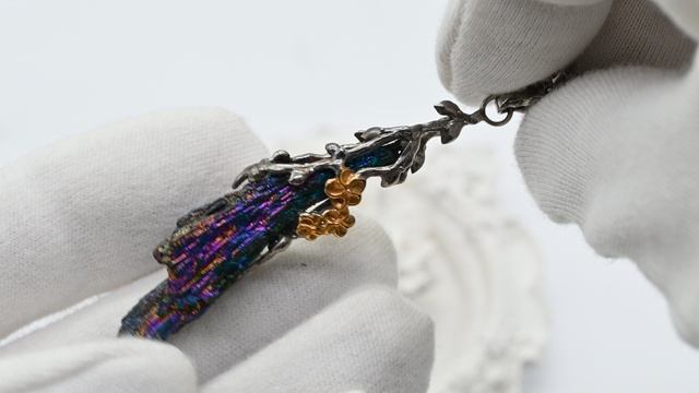 •Авторское украшение ручной работы. •Камни установлены в оправу из ювелирного сплава – нейзильбер с покрытием платино-рутения и позолотой. •Гальваническое покрытие золотом с использованием карандаша. •Форма и рисунок камня никогда не повторяются, что делает данное изделие единственным в своем роде. •Размер указан без учета петли. •Вес 8,9 г •Кианит титановый - черный кианит покрытый титановым сплавом. •Покрытие дает прочность и добавляет радужный перелив цвета.